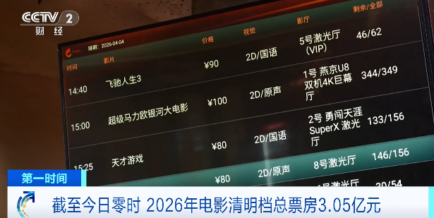 网络平台实时数据显示,截至今天零时,2026年电影清明档总票房(含预售)3.05亿元,观影场次达145.49万。多部不同题材影片同步发力,为春日观影市场注入活力。