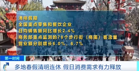 商务部商务大数据显示,清明假期,全国重点零售和餐饮企业日均销售额同比增长2.4%,商务部重点监测的78个步行街(商圈)客流量、营业额分别增长6.0%、6.7%。