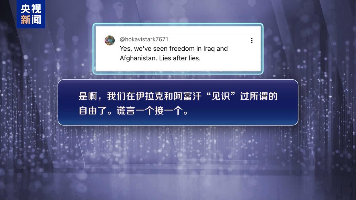 针对此番言论,有网友犀利地评论道:“是啊,我们在伊拉克和阿富汗‘见识’过所谓的自由了。谎言一个接一个。”