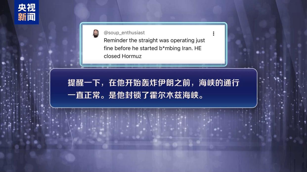 还有网友评论道,“提醒一下,在他开始轰炸伊朗之前,海峡的通行一直正常。是他封锁了霍尔木兹海峡。”