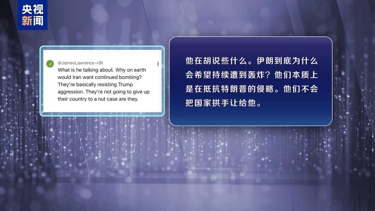 “他在胡说些什么。伊朗到底为什么会希望持续遭到轰炸?他们本质上是在抵抗特朗普的侵略。他们不会把国家拱手让给他。”