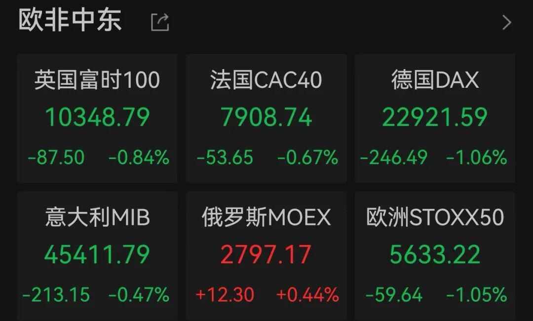 先于美股收市的欧洲股市主要股指多数收跌,英国富时100指数、法国CAC40指数、德国DAX指数分别下跌0.84%、0.67%、1.06%。