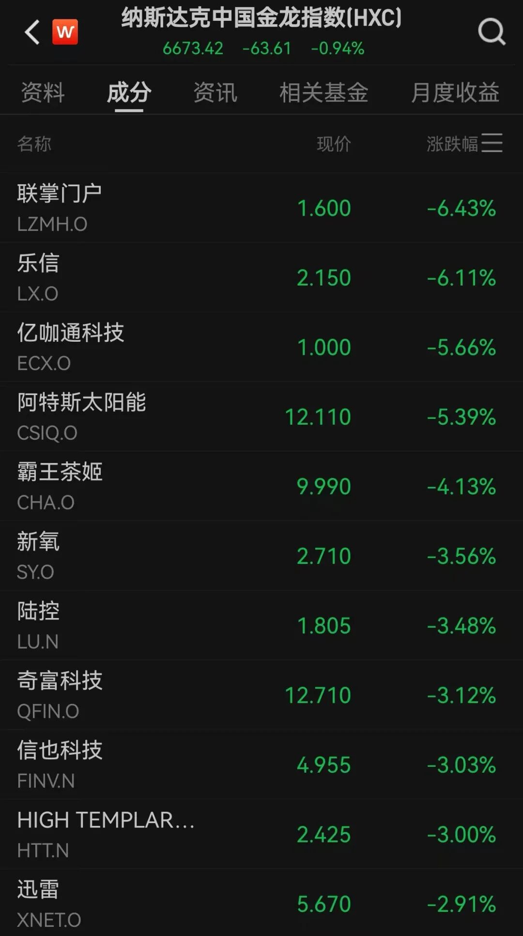 纳斯达克中国金龙指数跌0.94%。个股方面,阿特斯太阳能跌超5%,霸王茶姬跌超4%。