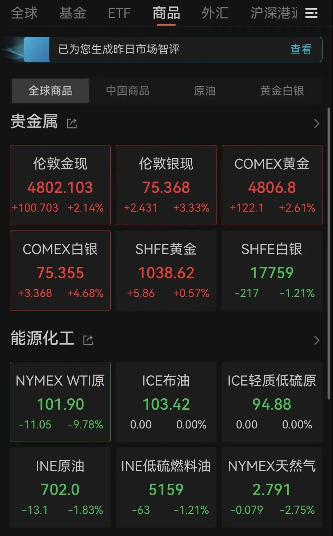 Wind数据显示,截至北京时间4月8日6:55,COMEX黄金期货价格、伦敦金现货价格双双涨逾2%,均收复4800美元/盎司关口,COMEX白银期货价格、伦敦银现货价格均大涨;NYMEX WTI原油期货主力合约下跌9.78%,报101.9美元/桶。