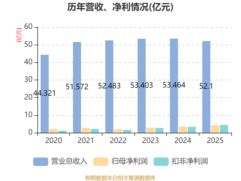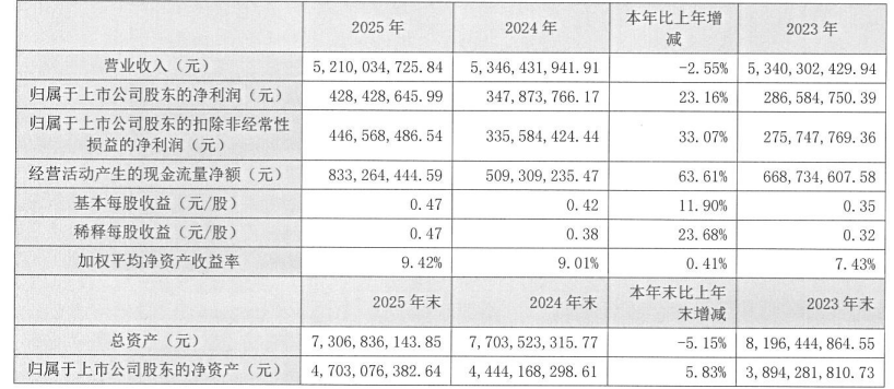 中证智能财讯孚日股份(002083)4月8日披露2025年年度报告。2025年,公司实现营业总收入52.1亿元,同比下降2.55%;归母净利润4.28亿元,同比增长23.16%;扣非净利润4.47亿元,同比增长33.07%;经营活动产生的现金流量净额为8.33亿元,同比增长63.61%;报告期内,孚日股份基本每股收益为0.47元,加权平均净资产收益率为9.42%。公司2025年度分配预案为:拟向全体股东每10股派现3元(含税)。