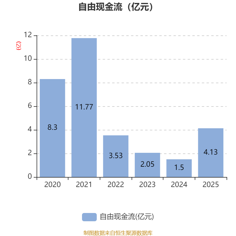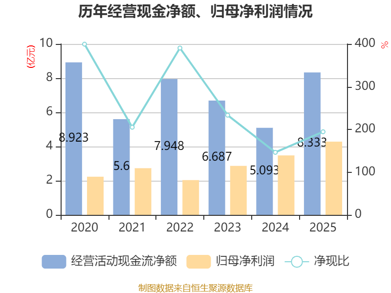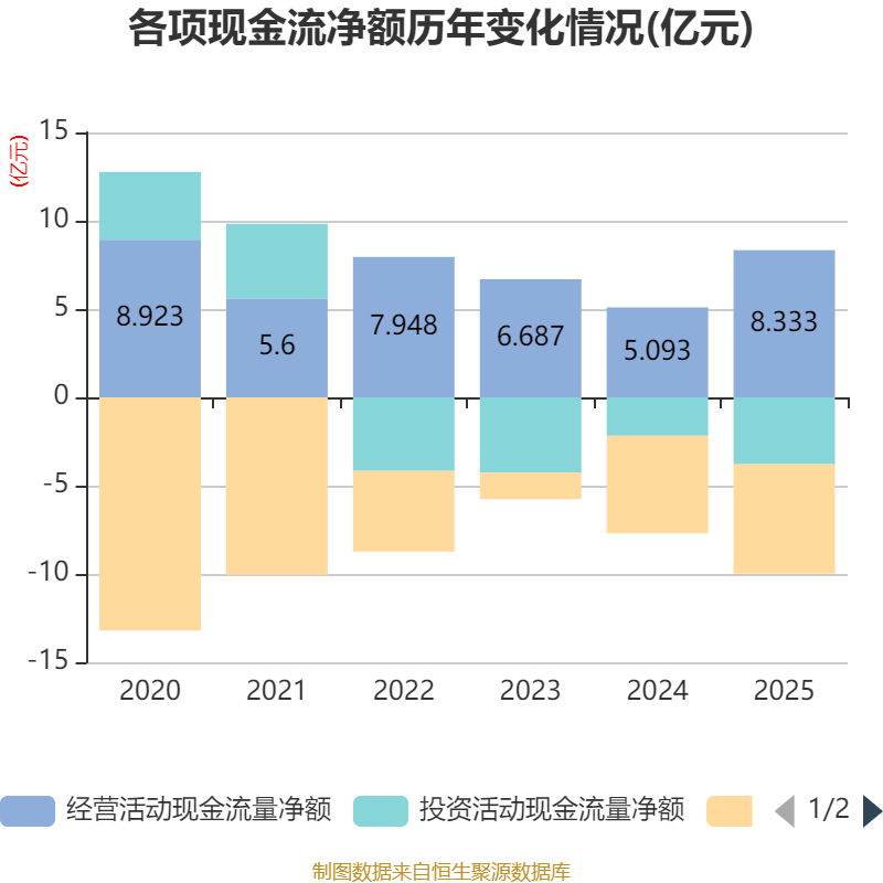 截至2025年,公司经营活动现金流净额为8.33亿元,同比增长63.61%;筹资活动现金流净额-6.19亿元,同比减少6661.81万元;投资活动现金流净额-3.79亿元,上年同期为-2.17亿元。