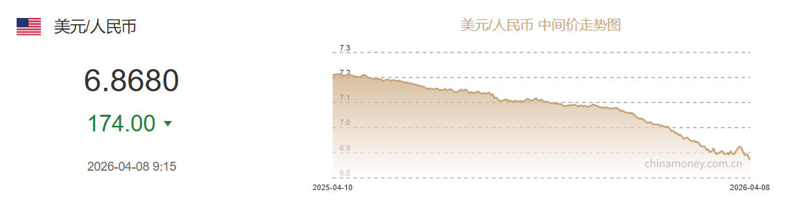 4月8日人民币对美元中间价报6.8680 上调174个基点
