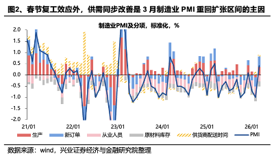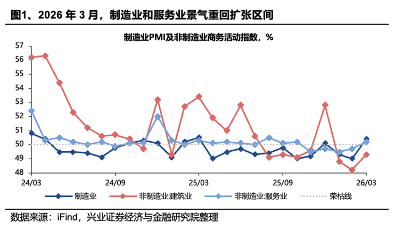 国内方面,2026年3月制造业PMI、非制造业商务活动指数均超预期回升并重返扩张区间,二者分别录得50.4%、50.1%,较上月分别上升1.4个和0.6个百分点。2026年3月生产指数和新订单指数分别升至51.4%和51.6%,较上月分别提升1.8和3.0个百分点。根据兴业宏观的分析,3月制造业PMI的回升具有显著的季节性特征,企业在春节假期后通常会加快复工复产,带动市场活跃度反弹。值得关注的是,今年3月PMI不仅高于荣枯线,也优于过去两年的均值水平,显示出经济在摆脱年初淡季影响后,具备较强的内生修复动能。结合1-2月实际GDP增速达到5.5%左右的强劲表现,3月制造业PMI的继续回升进一步夯实了“十五五”开局有力、起步平稳的增长基础。