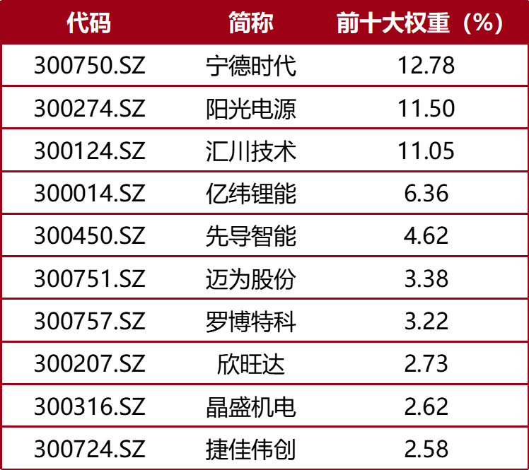 创业板新能源ETF(159387)指数主要跟踪的是创新能源指数。指数成份股涵盖了新能源或新能源汽车产业。其中,新能源产业包括太阳能、风能、生物质能、核能等;新能源汽车产业包括动力电池、电池材料、充电设施、整车、电机和电控等。截止2026年2月底,创业板新能源前十大权重股如图所示。