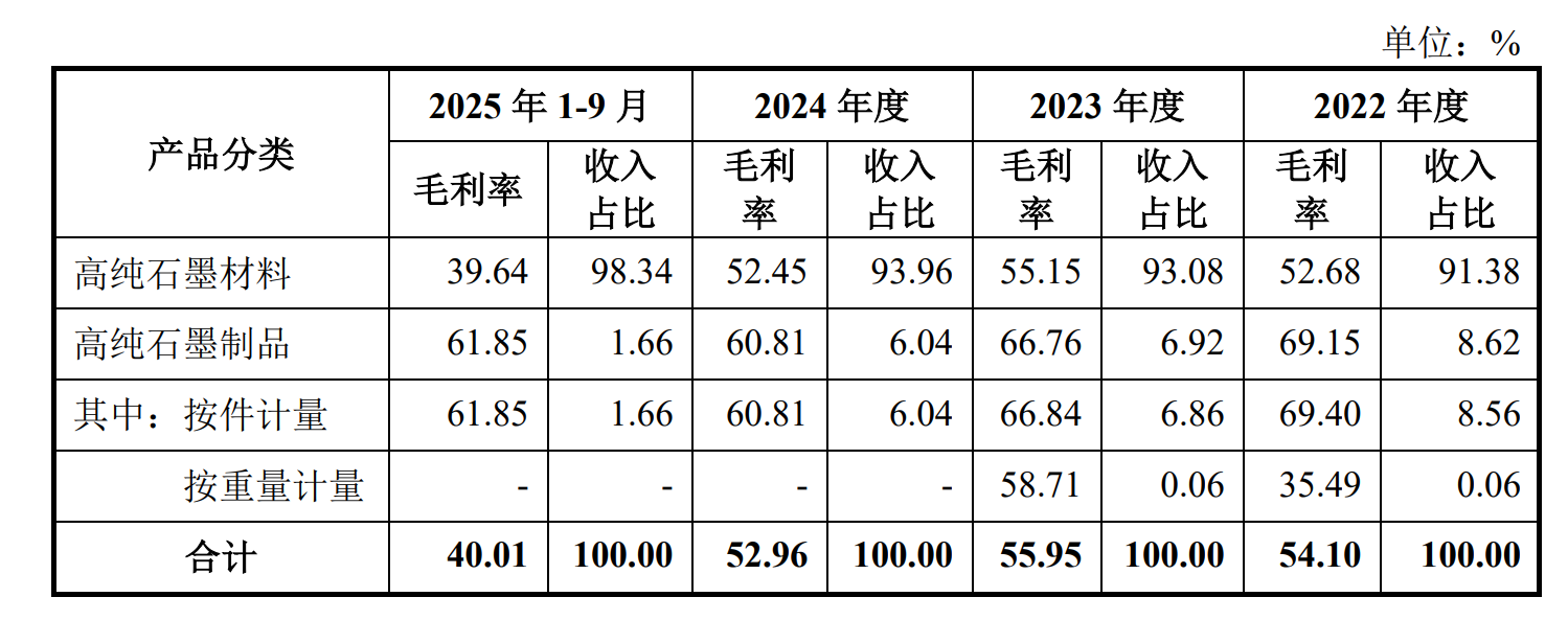 2025年前三季度,在同行可比公司(东方碳素、宁新新材等)平均毛利率为6.24%,五星新材的综合毛利率则为39.82%,是同行平均水平的5.38倍。这一差异较为罕见。五星新材解释称,差异源于“产品结构及应用领域不同”、“领先地位及品牌影响力”及“一焙一化”的先进工艺,但这仍难打消外界疑虑。