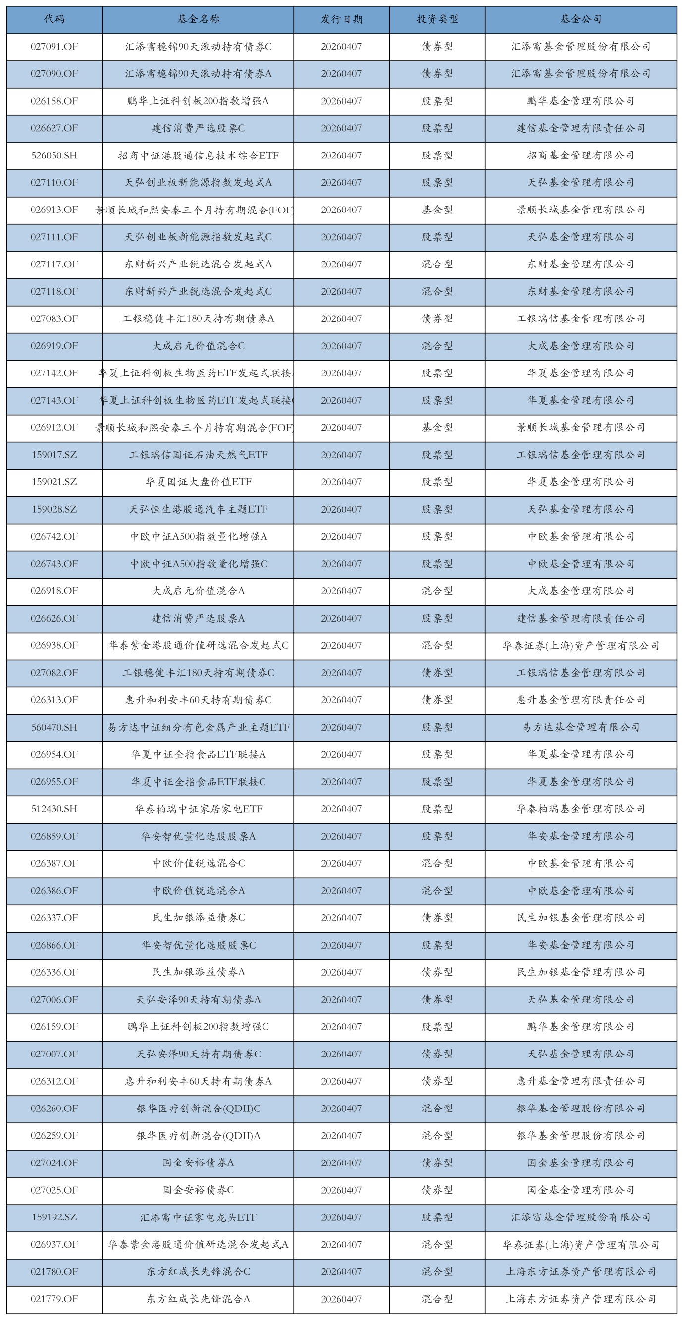 昨日有47只新基金发行,分别为:汇添富稳锦90天滚动持有债券C、汇添富稳锦90天滚动持有债券A、鹏华上证科创板200指数增强A、建信消费严选股票C、招商中证港股通信息技术综合ETF、天弘创业板新能源指数发起式A、景顺长城和熙安泰三个月持有期混合(FOF)C、天弘创业板新能源指数发起式C、东财新兴产业锐选混合发起式A、东财新兴产业锐选混合发起式C、工银稳健丰汇180天持有期债券A、大成启元价值混合C、华夏上证科创板生物医药ETF发起式联接A、华夏上证科创板生物医药ETF发起式联接C、景顺长城和熙安泰三个月持有期混合(FOF)A、工银瑞信国证石油天然气ETF、华夏国证大盘价值ETF、天弘恒生港股通汽车主题ETF、中欧中证A500指数量化增强A、中欧中证A500指数量化增强C、大成启元价值混合A、建信消费严选股票A、华泰紫金港股通价值研选混合发起式C、工银稳健丰汇180天持有期债券C、惠升和利安丰60天持有期债券C、易方达中证细分有色金属产业主题ETF、华夏中证全指食品ETF联接A、华夏中证全指食品ETF联接C、华泰柏瑞中证家居家电ETF、华安智优量化选股股票A、中欧价值锐选混合C、中欧价值锐选混合A、民生加银添益债券C、华安智优量化选股股票C、民生加银添益债券A、天弘安泽90天持有期债券A、鹏华上证科创板200指数增强C、天弘安泽90天持有期债券C、惠升和利安丰60天持有期债券A、银华医疗创新混合(QDII)C、银华医疗创新混合(QDII)A、国金安裕债券A、国金安裕债券C、汇添富中证家电龙头ETF、华泰紫金港股通价值研选混合发起式A、东方红成长先锋混合C、东方红成长先锋混合A,详情见下表: