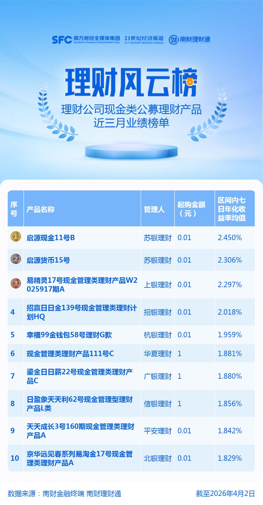 产品统计范围为理财公司发行的公募现金类产品,统计截止日期为2026年4月2日,统计区间为近3个月。