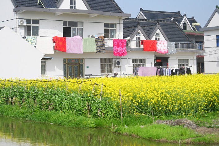 走进富圩村,最直观的感受是视野的开阔与肌理的独特。站在田埂上望去,白墙灰瓦的农舍散落在田边,宅前的小院里种着油菜花,晾衣绳上挂着五颜六色的衣衫。几头崇明水牛正悠闲地在稻田里踱步,偶尔甩动尾巴。一群白鹭从不远处的林梢掠过,远处,一座彩绘水塔矗立,成为这片平坦土地上唯一的制高点,也是归鸟辨认方向的坐标。