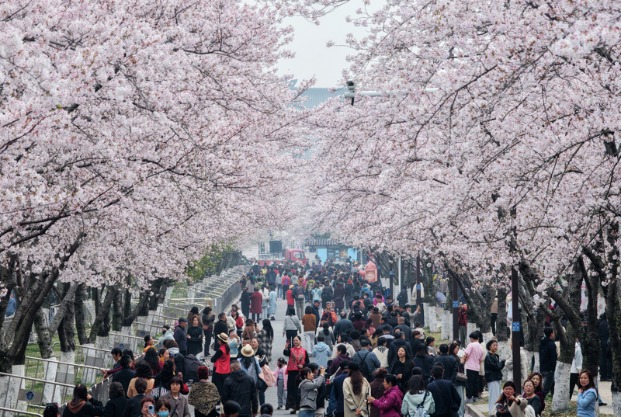 3月31日,游客在江苏省扬州市鉴真路上的“樱花大道”赏樱游玩(无人机照片)。 新华社发(孟德龙摄)