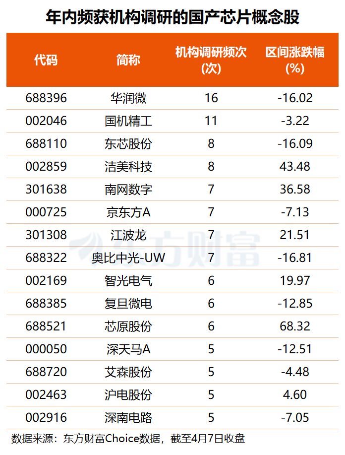 机构关注度方面,年初至今,共有36只国产芯片概念股获得3次及以上机构调研,华润微机构关注度最高,年内被调研次数高达16次,国机精工也获11次机构调研,洁美科技、东芯股份、江波龙、沪电股份等13股的机构调研次数均在5次至8次之间。