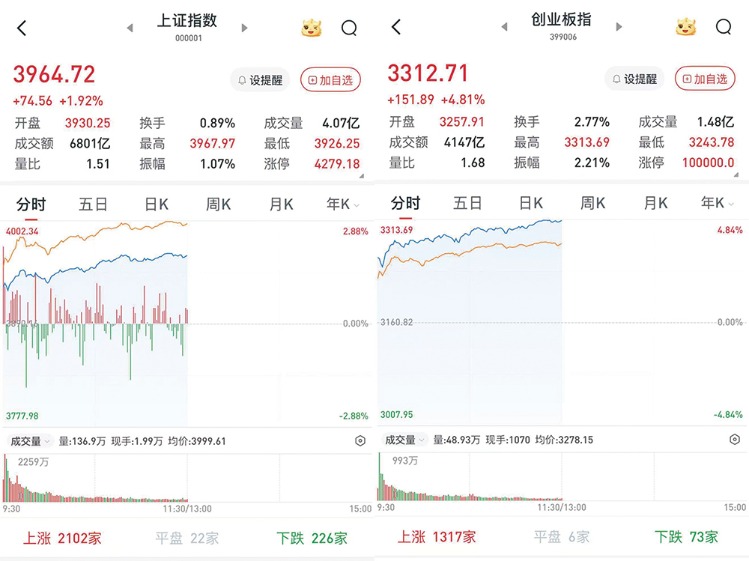 至午间收盘,上证综指涨1.92%,报3964.72点;深证成指涨3.87%,报13919.13点;创业板指涨4.81%,报3312.71点。