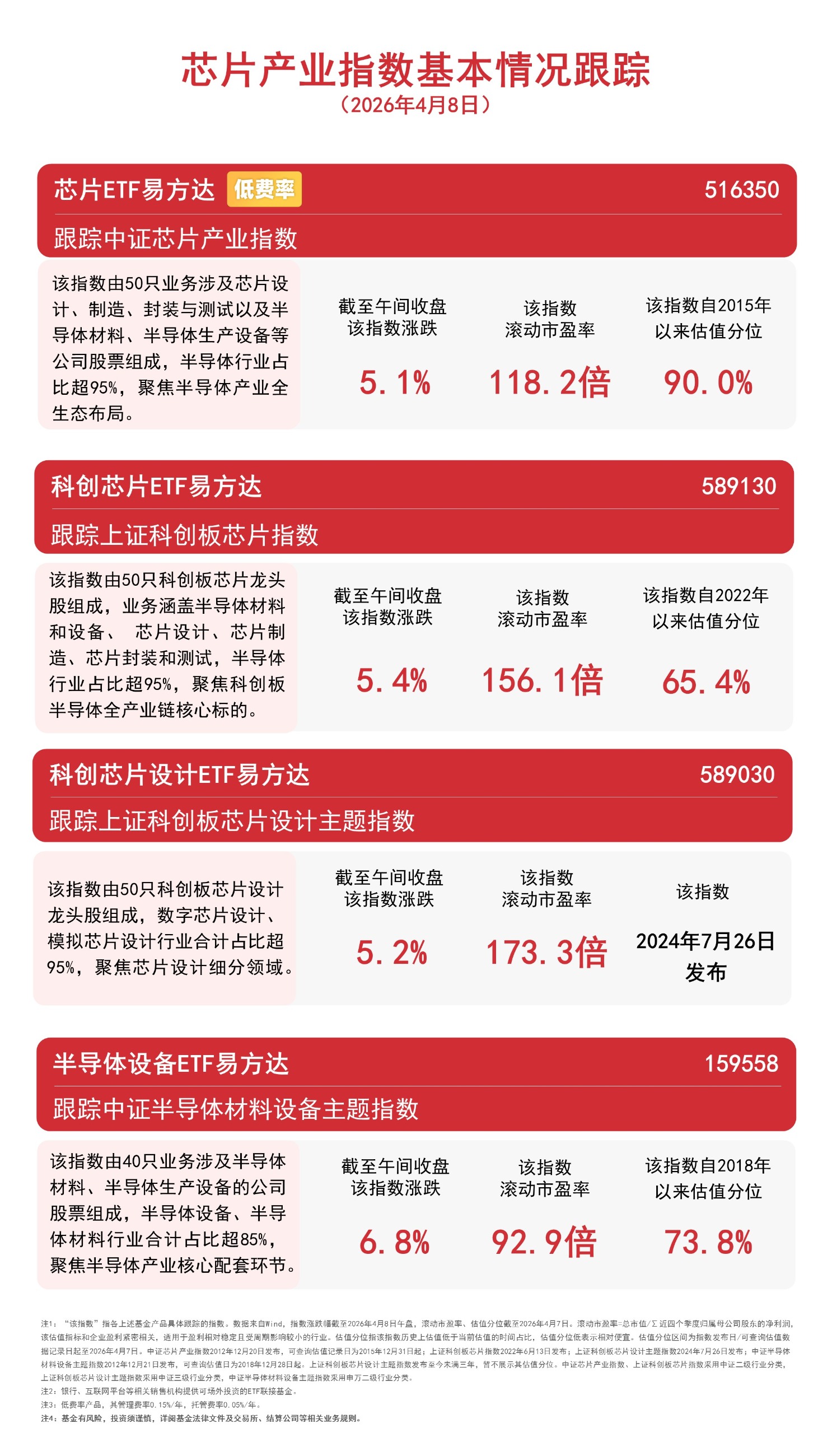 截至午间收盘,中证半导体材料设备主题指数上涨6.8%,上证科创板芯片指数上涨5.4%,上证科创板芯片设计主题指数上涨5.2%,中证芯片产业指数上涨5.1%。
