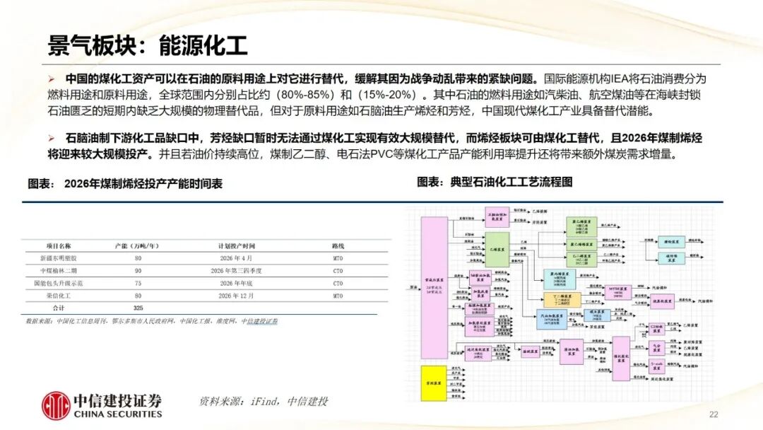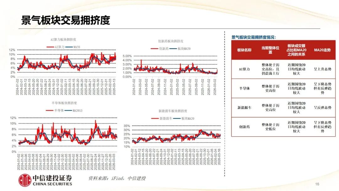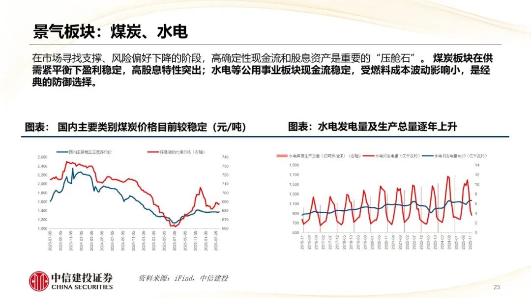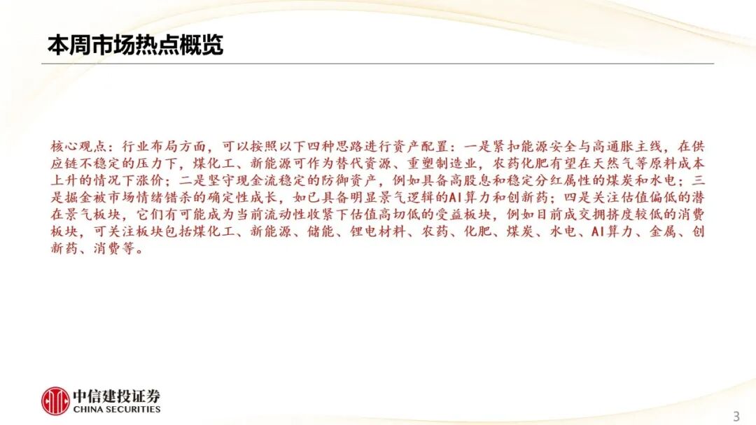 行业布局方面,可以按照以下四种思路进行资产配置:一是紧扣能源安全与高通胀主线,在供应链不稳定的压力下,煤化工、新能源可作为替代资源、重塑制造业,农药化肥有望在天然气等原料成本上升的情况下涨价;二是坚守现金流稳定的防御资产,例如具备高股息和稳定分红属性的煤炭和水电;三是掘金被市场情绪错杀的确定性成长,如已具备明显景气逻辑的AI算力和创新药;四是关注估值偏低的潜在景气板块,它们有可能成为当前流动性收紧下估值高切低的受益板块,例如目前成交拥挤度较低的消费板块,可关注板块包括煤化工、新能源、储能、锂电材料、农药、化肥、煤炭、水电、AI算力、金属、创新药、消费等。