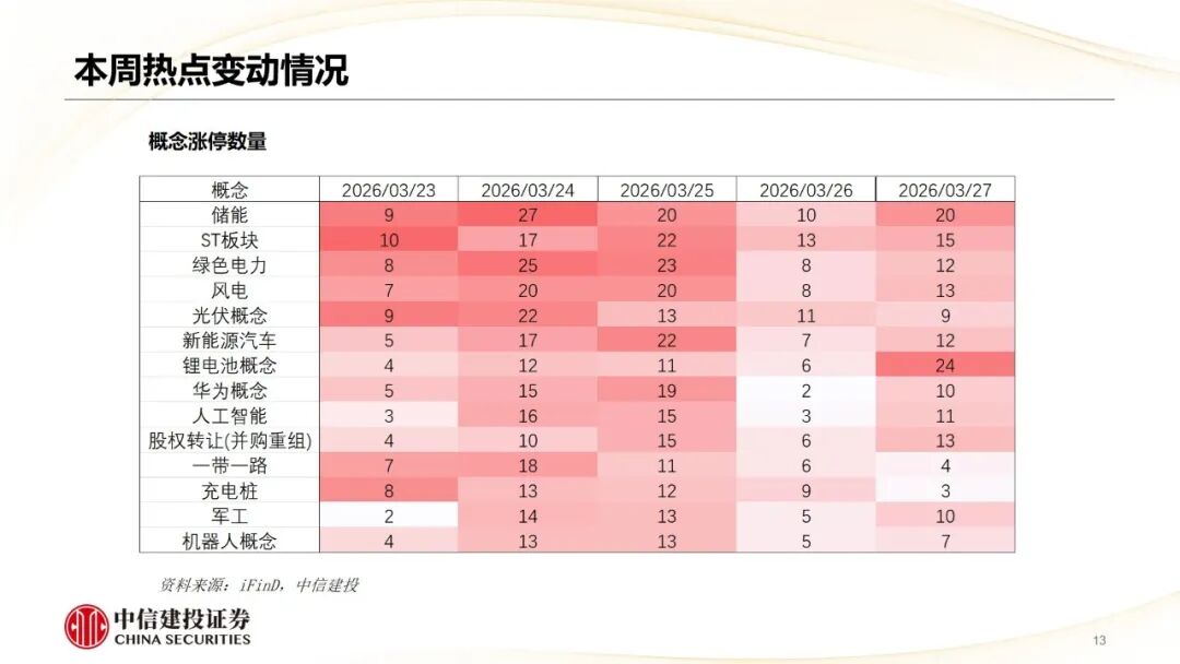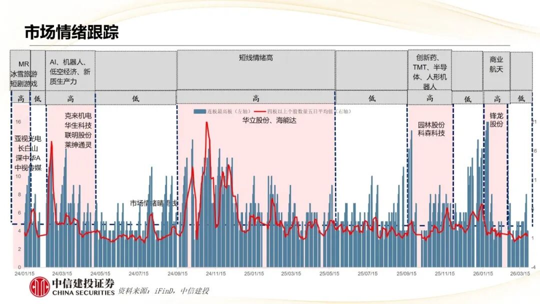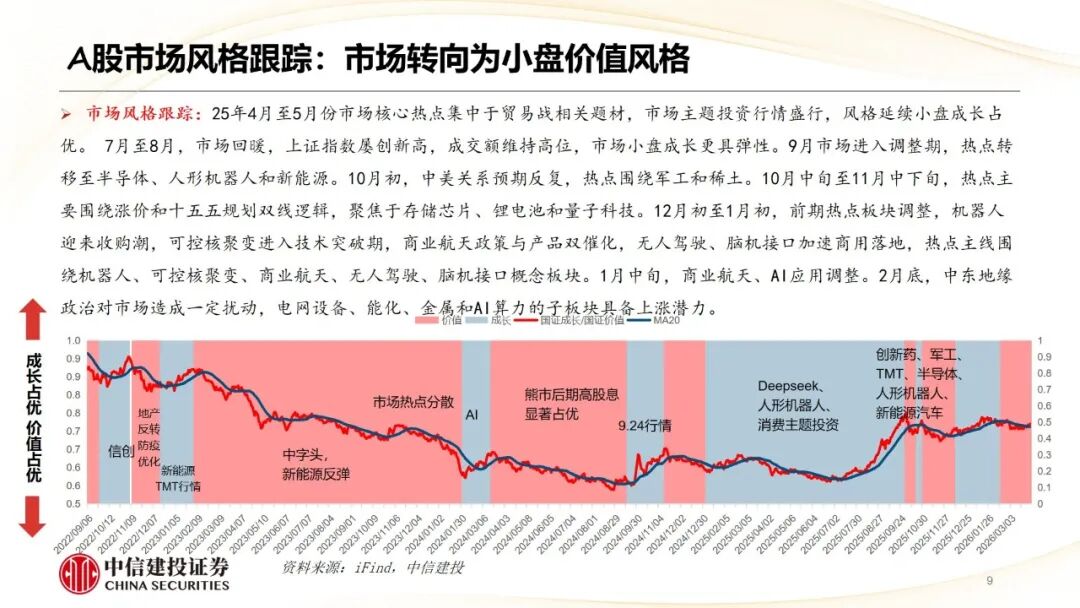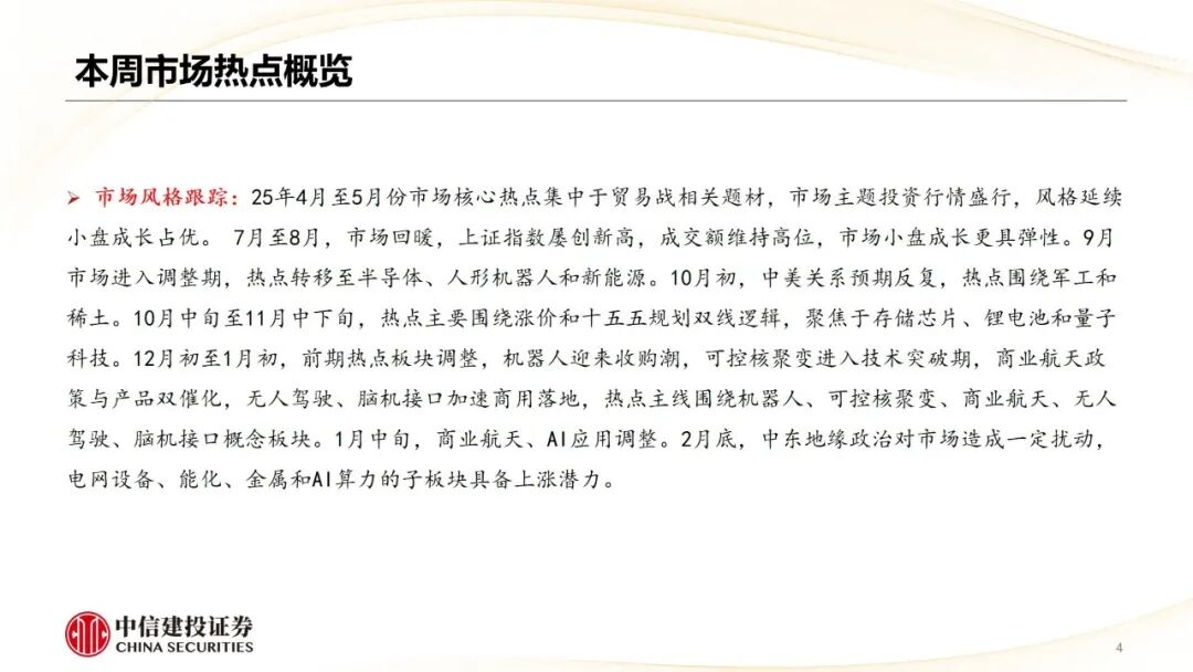 市场风格跟踪:25年4月至5月份市场核心热点集中于贸易战相关题材,市场主题投资行情盛行,风格延续小盘成长占优。 7月至8月,市场回暖,上证指数屡创新高,成交额维持高位,市场小盘成长更具弹性。9月市场进入调整期,热点转移至半导体、人形机器人和新能源。10月初,中美关系预期反复,热点围绕军工和稀土。10月中旬至11月中下旬,热点主要围绕涨价和十五五规划双线逻辑,聚焦于存储芯片、锂电池和量子科技。12月初至1月初,前期热点板块调整,机器人迎来收购潮,可控核聚变进入技术突破期,商业航天政策与产品双催化,无人驾驶、脑机接口加速商用落地,热点主线围绕机器人、可控核聚变、商业航天、无人驾驶、脑机接口概念板块。1月中旬,商业航天、AI应用调整。2月底,中东地缘政治对市场造成一定扰动,电网设备、能化、金属和AI算力的子板块具备上涨潜力。