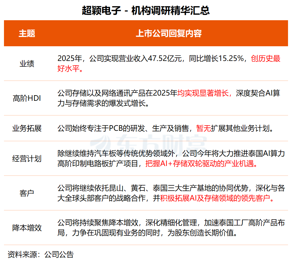 超颖电子于昨日举行的业绩说明会上表示,2026年,除继续维持汽车板等传统优势领域外,公司将大力推进泰国AI算力高阶印制电路板扩产项目,强化布局高阶AI产品的PCB产能,把握AI+存储双轮驱动的产业机遇。