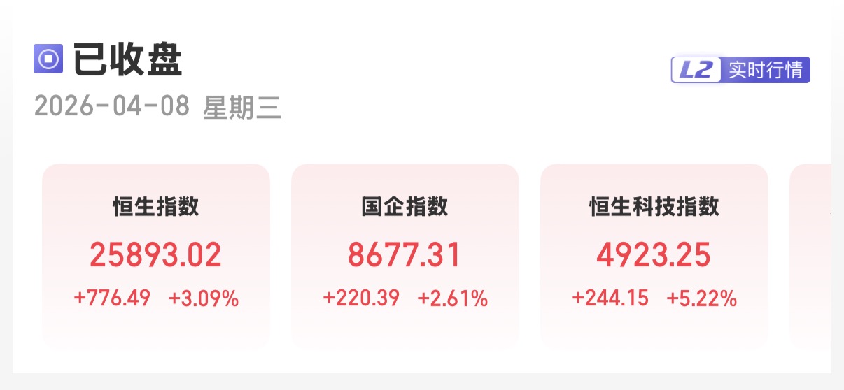上证报中国证券网讯(卢伊记者严晓菲)4月8日,港股三大指数集体收涨。截至收盘,恒生指数涨3.09%,报25893.02点;恒生国企指数涨2.61%,报8677.31点;恒生科技指数大涨5.22%,报4923.25点。