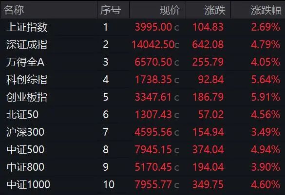 4月8日,A股大幅高开高走,上证指数大涨逾百点,收复3900点并逼近4000点大关,深证成指大涨逾4%重回14000点之上,创业板指、科创综指均飙升超5%。超5200只个股上涨,成交急速放大至2.45万亿元,创近1个月新高。