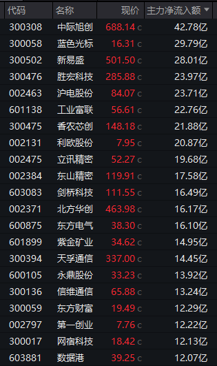 个股方面,中际旭创获得逾42亿元主力资金净流入,蓝色光标、新易盛、胜宏科技等7股获得超20亿元净流入,立讯精密、东山精密等17股也获得超10亿元净流入。