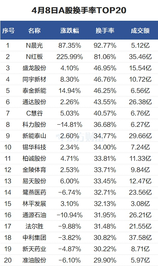 当天换手率最高的个股为N晨光,全天换手率92.77%。N红板紧随其后,全天换手率81.06%。