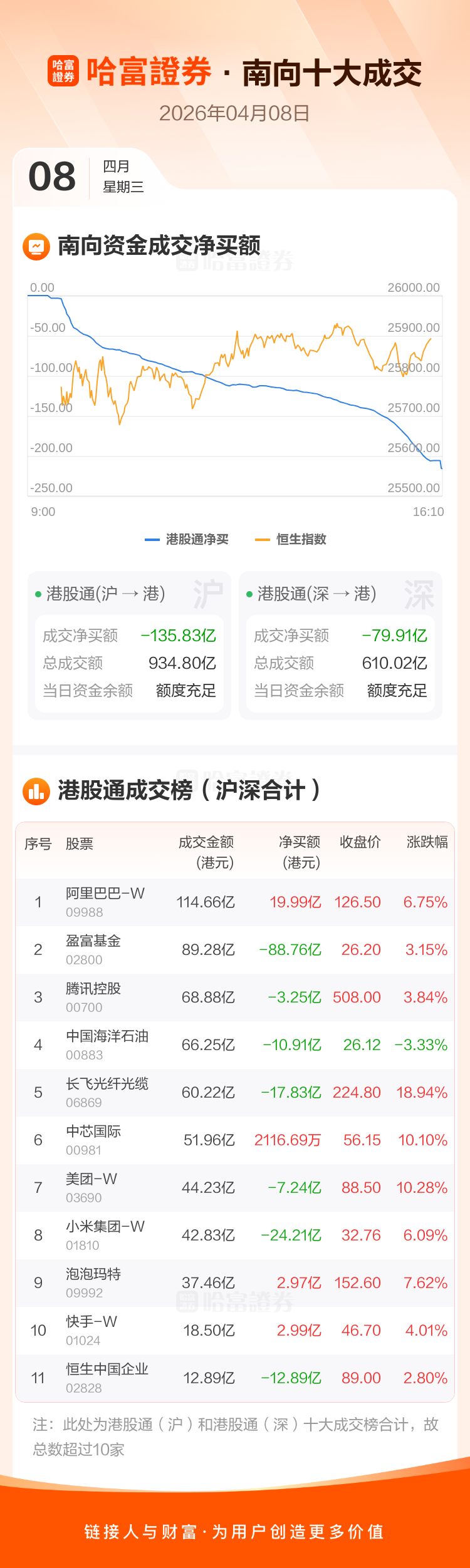 恒生指数4月8日涨3.09%,收报25893.02点。南向资金今日净卖出港股215.74亿港元。南向资金今日成交额1544.82亿港元,港股大市成交3724.37亿港元。
