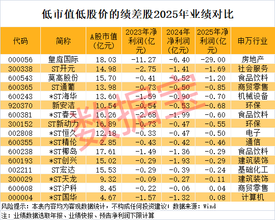 从已披露的业绩数据来看,按照年报、业绩快报、预告净利润下限(无下限则取公告数值)计算,上述16只低价低市值且业绩连亏的股票中,2025年净利润亏损的股票有14只,皇庭国际、ST开元、莫高股份净利润亏损金额超1亿元。
