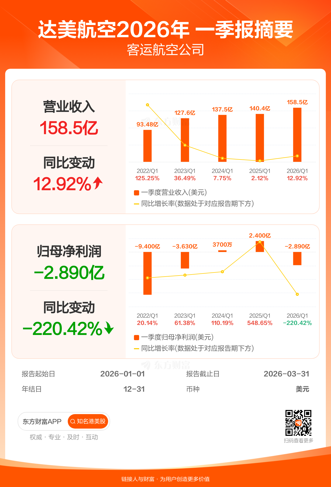 达美航空4月8日发布一季报业绩,截至2026年3月31日的3个月内,该公司营业收入158.54亿美元,同比增长12.92%;公司权益持有人应占溢利(归母净利润)-2.89亿美元,上年同期2.40亿美元。