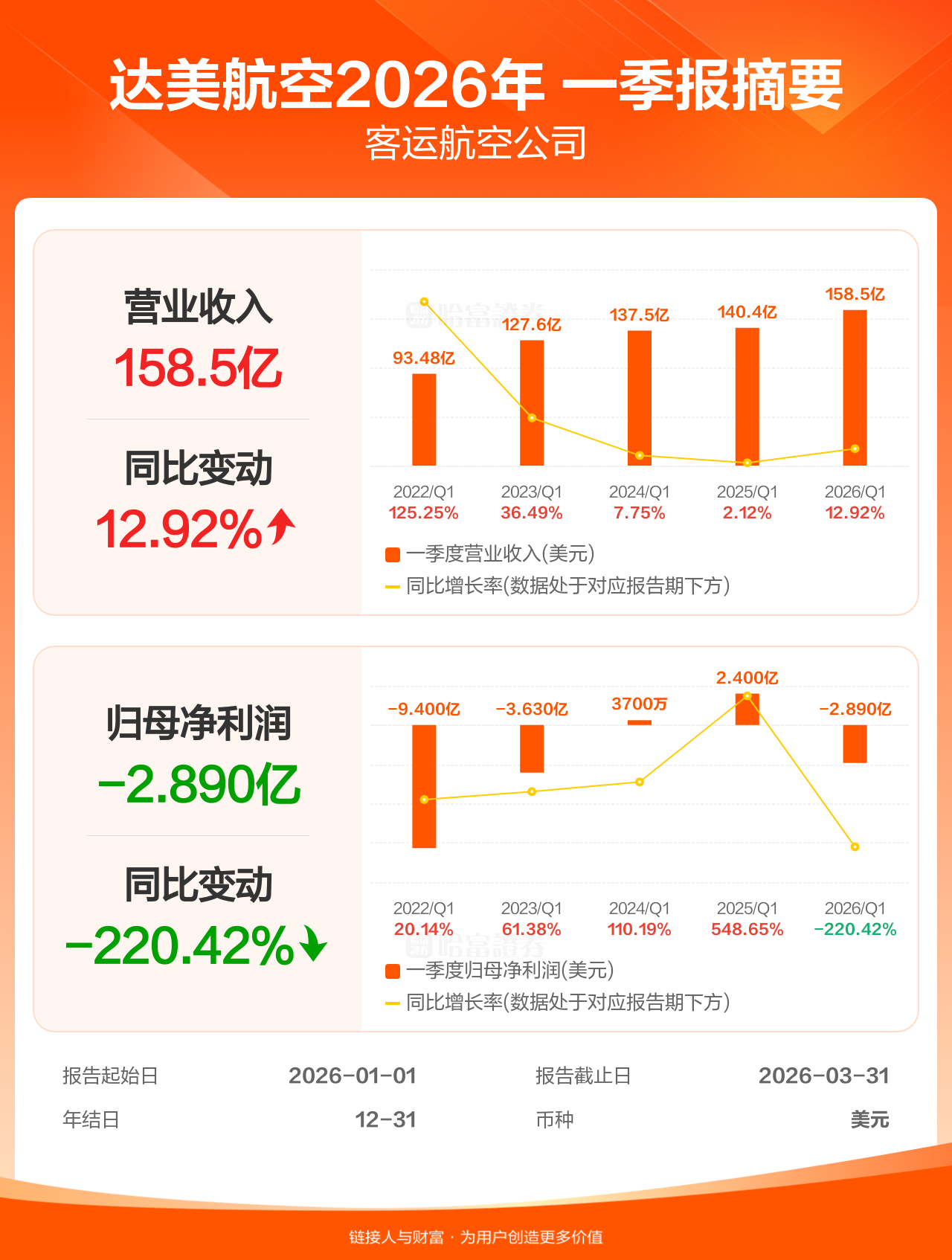 达美航空4月8日发布一季报业绩,截至2026年3月31日的3个月内,该公司营业收入158.54亿美元,同比增长12.92%;公司权益持有人应占溢利(归母净利润)-2.89亿美元,上年同期2.40亿美元。