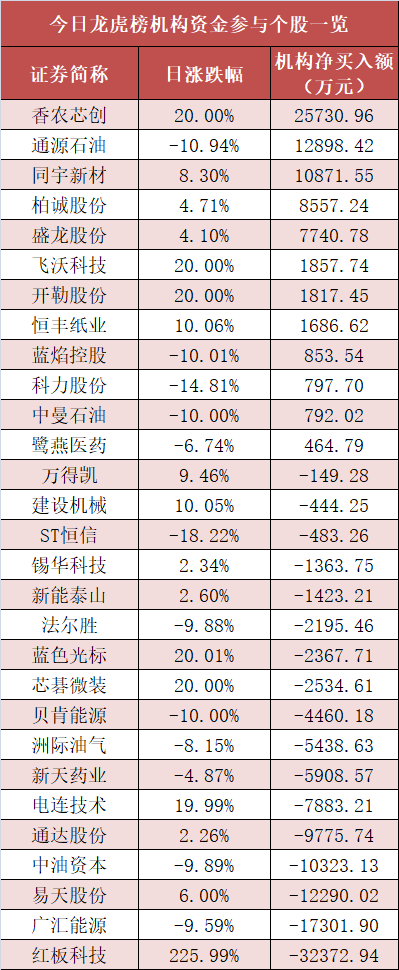 盘后龙虎榜数据显示,机构现身多股,其中香农芯创等股票呈现机构资金净买入,红板科技等股票呈现机构资金净卖出。