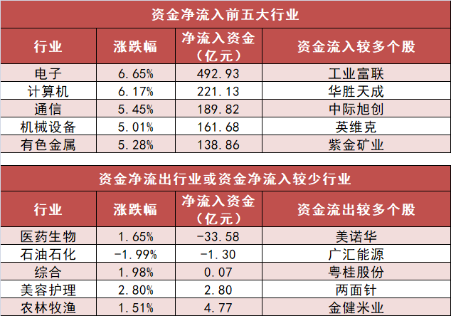 申万一级行业中,29个行业实现资金净流入,其中电子行业净流入492.93亿元居首。