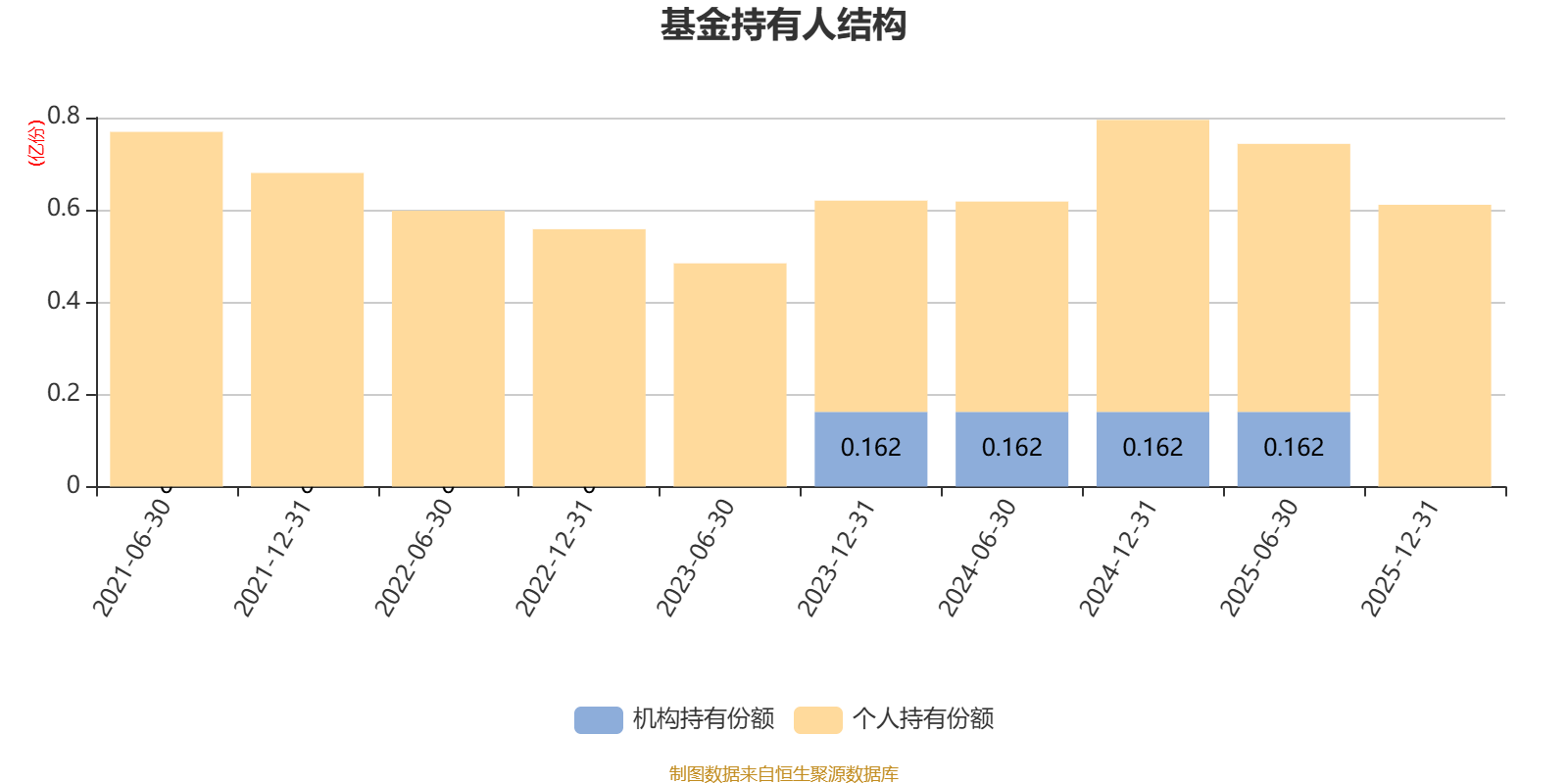 截至2025年12月31日,基金持有人共计1264户,合计持有6106.18万份。其中管理人员工持有44.65万份,占比0.73%,个人投资者占比100.00%。