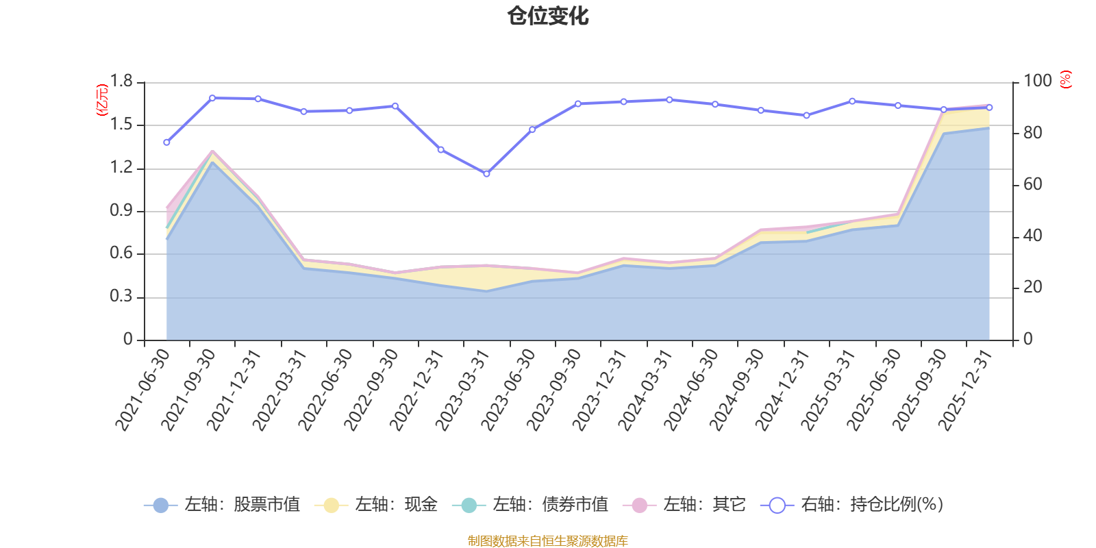 据定期报告数据统计,近三年平均股票仓位为87.86%,同类平均为84.04%。2021年三季度末基金达到93.86%的最高仓位,2023年一季度末最低,为64.49%。
