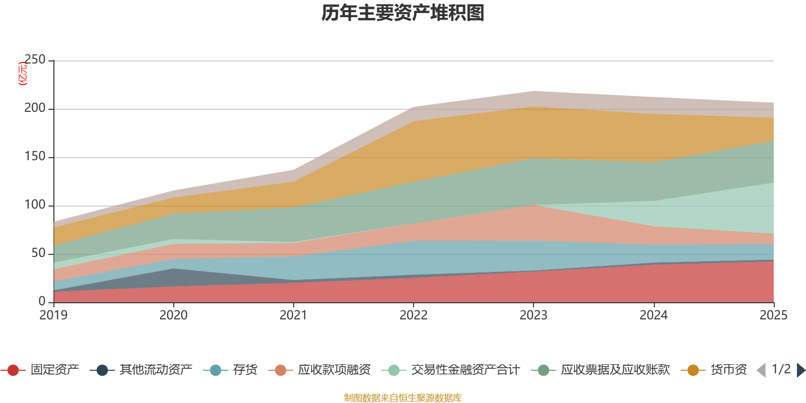 资产重大变化方面,截至2025年末,公司交易性金融资产合计较上年末增加101.41%,占公司总资产比重上升13.22个百分点;货币资金较上年末减少52.16%,占公司总资产比重下降11.98个百分点;应收款项融资较上年末减少42.71%,占公司总资产比重下降3.67个百分点;固定资产较上年末增加8.96%,占公司总资产比重上升2.22个百分点。