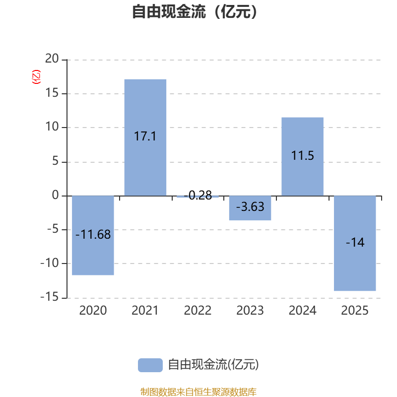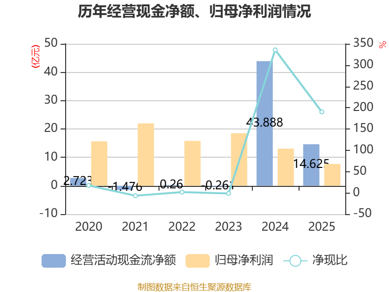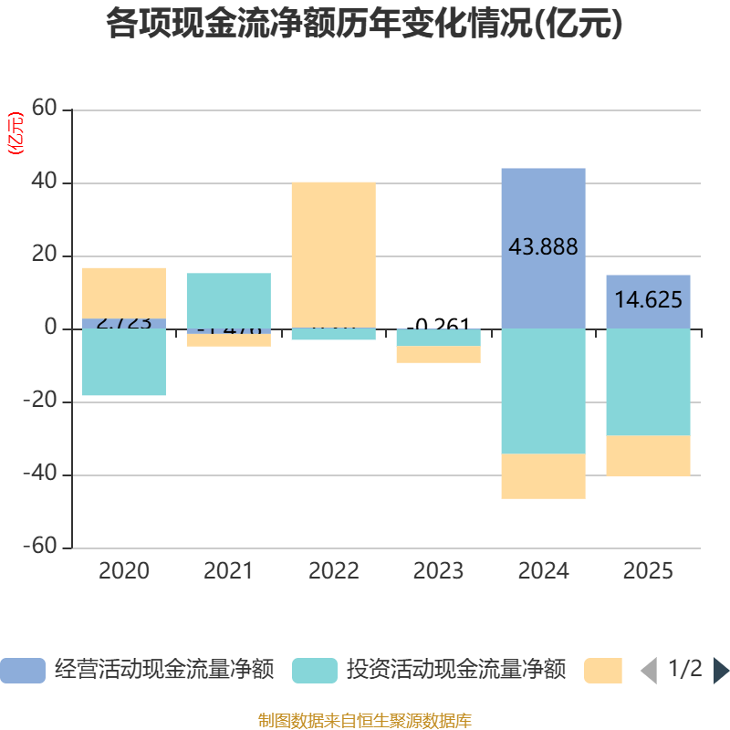 截至2025年,公司经营活动现金流净额为14.62亿元,同比下降66.68%;筹资活动现金流净额-11.12亿元,同比增加1.19亿元;投资活动现金流净额-29.38亿元,上年同期为-34.39亿元。