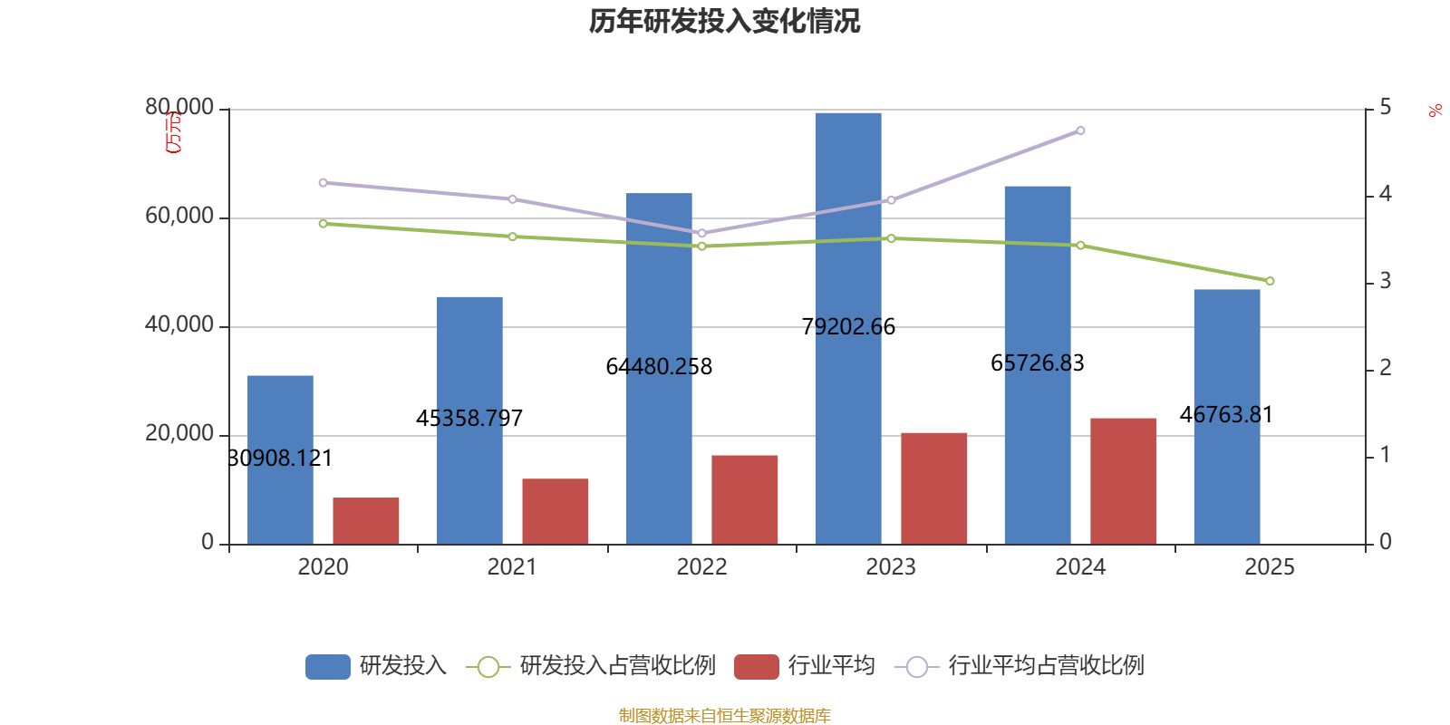 2025年全年,公司研发投入金额为4.68亿元,同比下降28.85%;研发投入占营业收入比例为3.02%,相比上年同期下降0.41个百分点。此外,公司全年研发投入资本化率为0%。