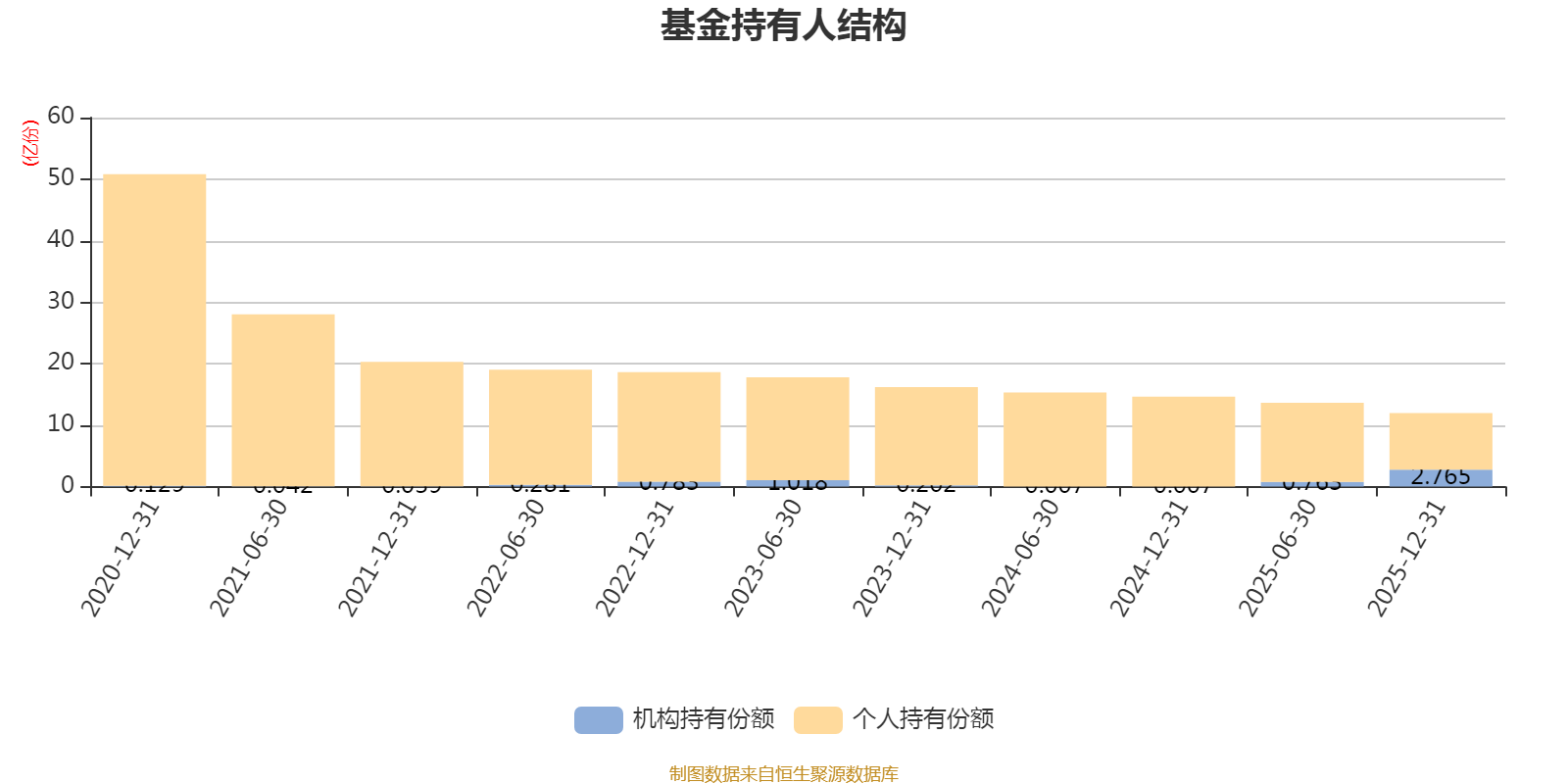 截至2025年12月31日,基金持有人共计2.58万户,合计持有11.94亿份。其中管理人员工持有212.02万份,占比0.18%,机构持有份额占比23.16%,个人投资者占比76.84%。