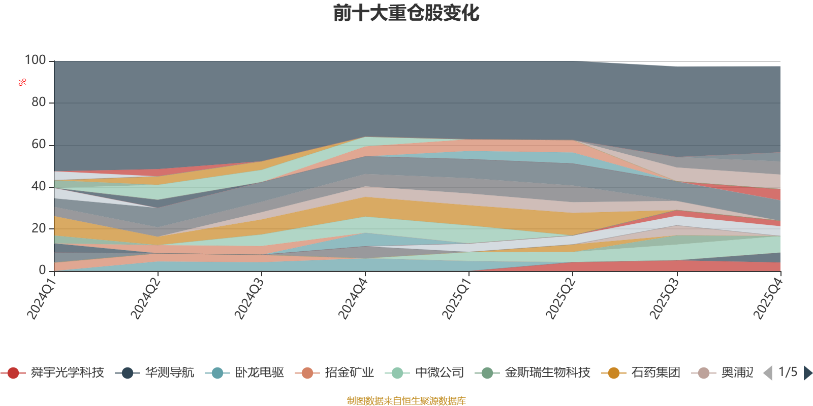 截至2025年末,基金十大重仓股分别是鼎胜新材、中微公司、福瑞医科、博杰股份、三花智控、华测导航、英杰电气、胜宏科技、舜宇光学科技、百济神州。