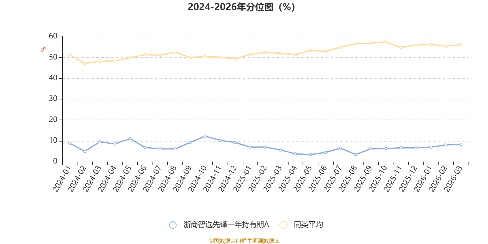通过所选区间该基金净值增长率分位图,可以观察该基金与同类基金业绩比较情况。图为坐标原点到区间内某时点的净值增长率在同类基金中的分位数。