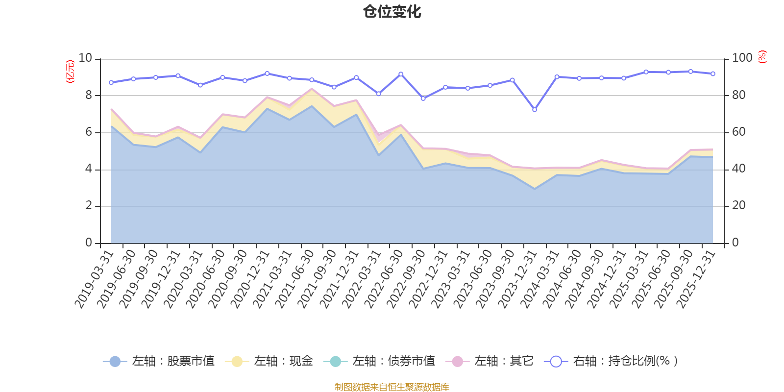 据定期报告数据统计,近三年平均股票仓位为88.33%,同类平均为72.57%。2025年三季度末基金达到93.13%的最高仓位,2023年末最低,为72.45%。