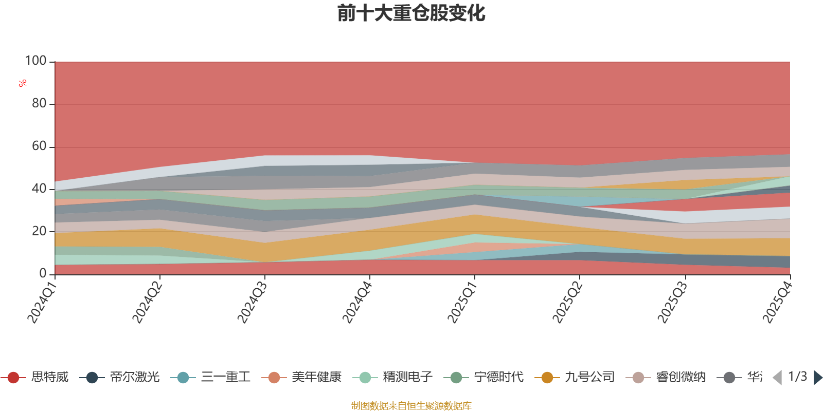截至2025年末,基金十大重仓股分别是睿创微纳、九号公司、平安好医生、三棵树、爱旭股份、帝尔激光、奕瑞科技、三一重能、广钢气体、思特威。