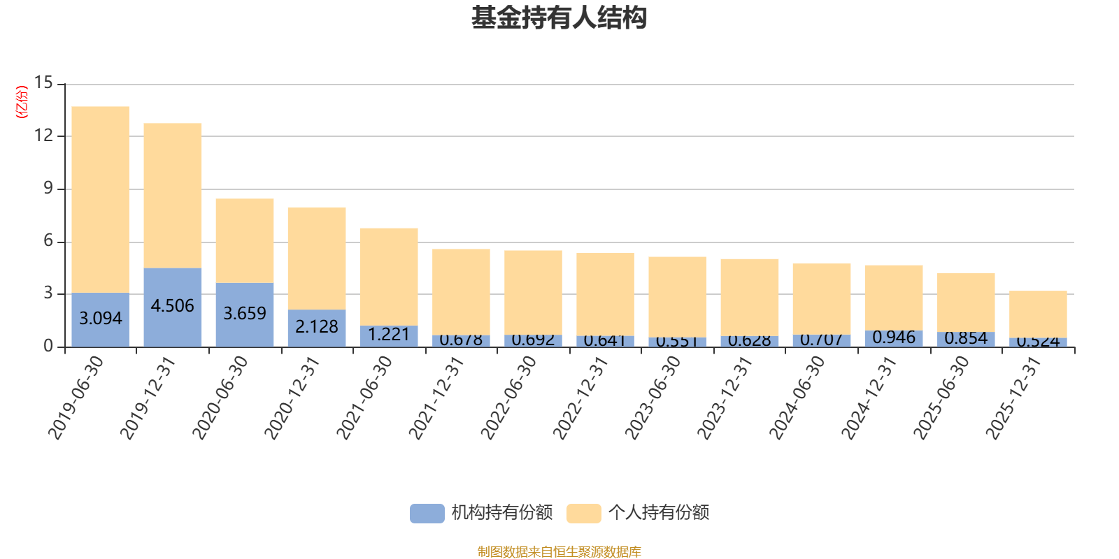 截至2025年12月31日,基金持有人共计9.59万户,合计持有3.2亿份。其中管理人员工持有294.08万份,占比0.92%,机构持有份额占比16.35%,个人投资者占比83.65%。