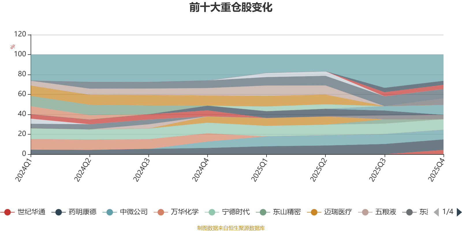 该基金持股集中度较高,近2年前十大重仓股集中度长期超过60%。截至2025年末,基金十大重仓股分别是宁德时代、药明康德、新易盛、中微公司、北方华创、雅克科技、世纪华通、立讯精密、东鹏饮料、恒瑞医药。