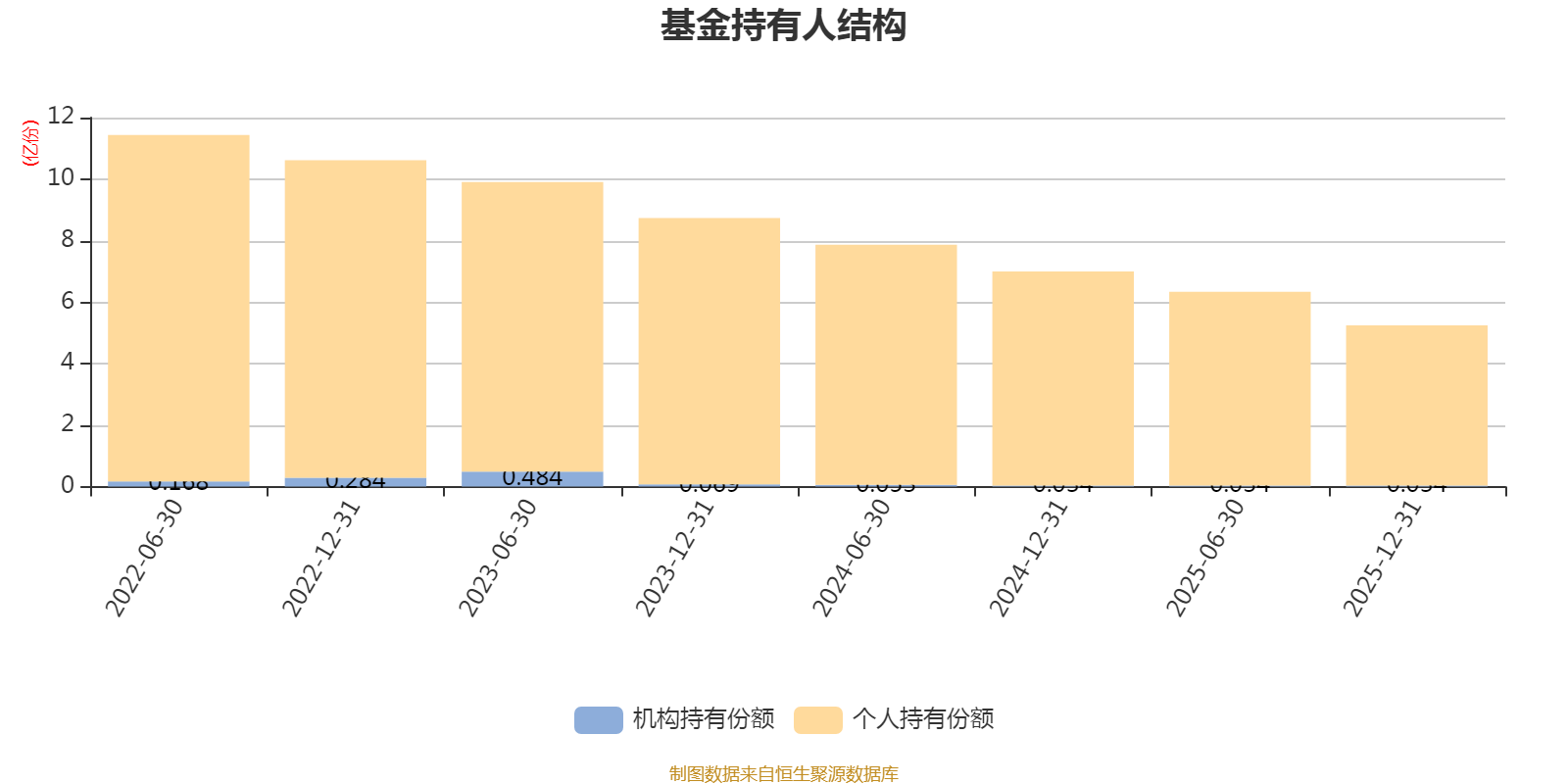 截至2025年12月31日,基金持有人共计1.03万户,合计持有5.25亿份。其中管理人员工持有5.67万份,占比0.01%,机构持有份额占比0.64%,个人投资者占比99.36%。