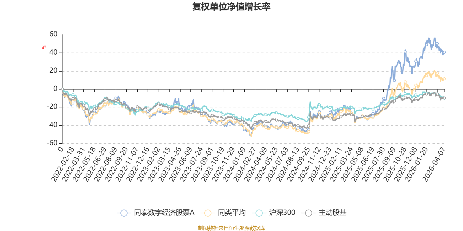 截至4月7日,同泰数字经济股票A近三个月复权单位净值增长率为-2.00%,位于同类可比基金27/63;近半年复权单位净值增长率为9.09%,位于同类可比基金22/63;近一年复权单位净值增长率为123.19%,位于同类可比基金12/63;近三年复权单位净值增长率为56.59%,位于同类可比基金21/53。