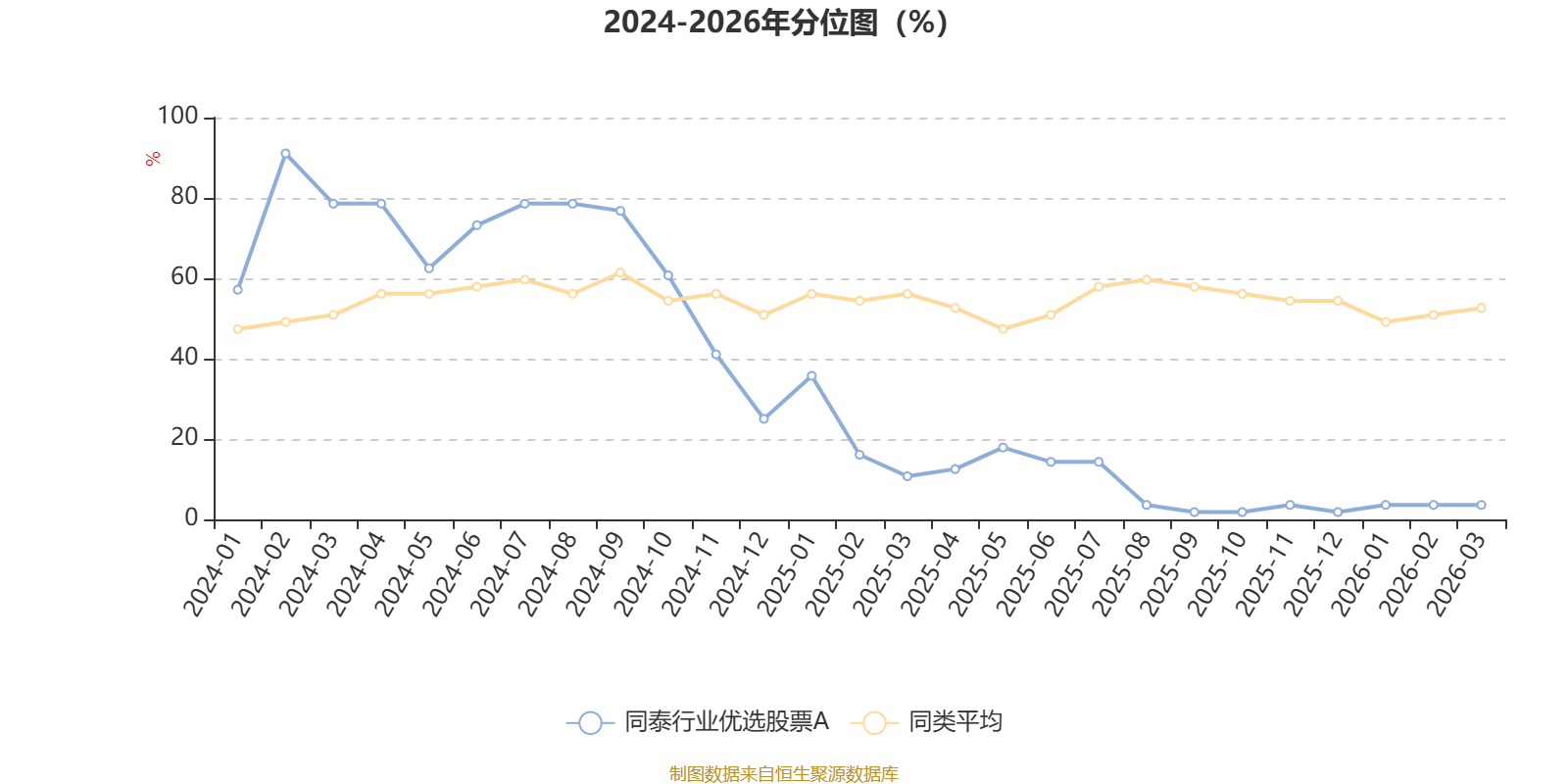 通过所选区间该基金净值增长率分位图,可以观察该基金与同类基金业绩比较情况。图为坐标原点到区间内某时点的净值增长率在同类基金中的分位数。