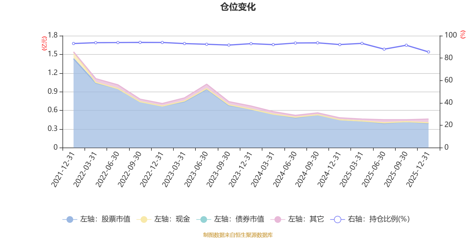 据定期报告数据统计,近三年平均股票仓位为91.61%,同类平均为88.36%。2022年三季度末基金达到94.04%的最高仓位,2025年末最低,为85.53%。